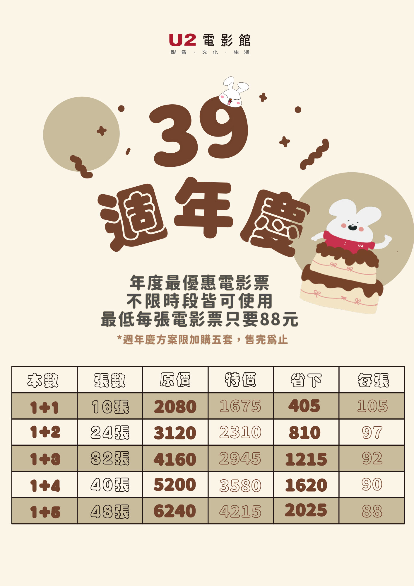 週年慶大回饋114/10/1~114/10/31於U2各分館購買電子票第二套起享39%off的折扣!