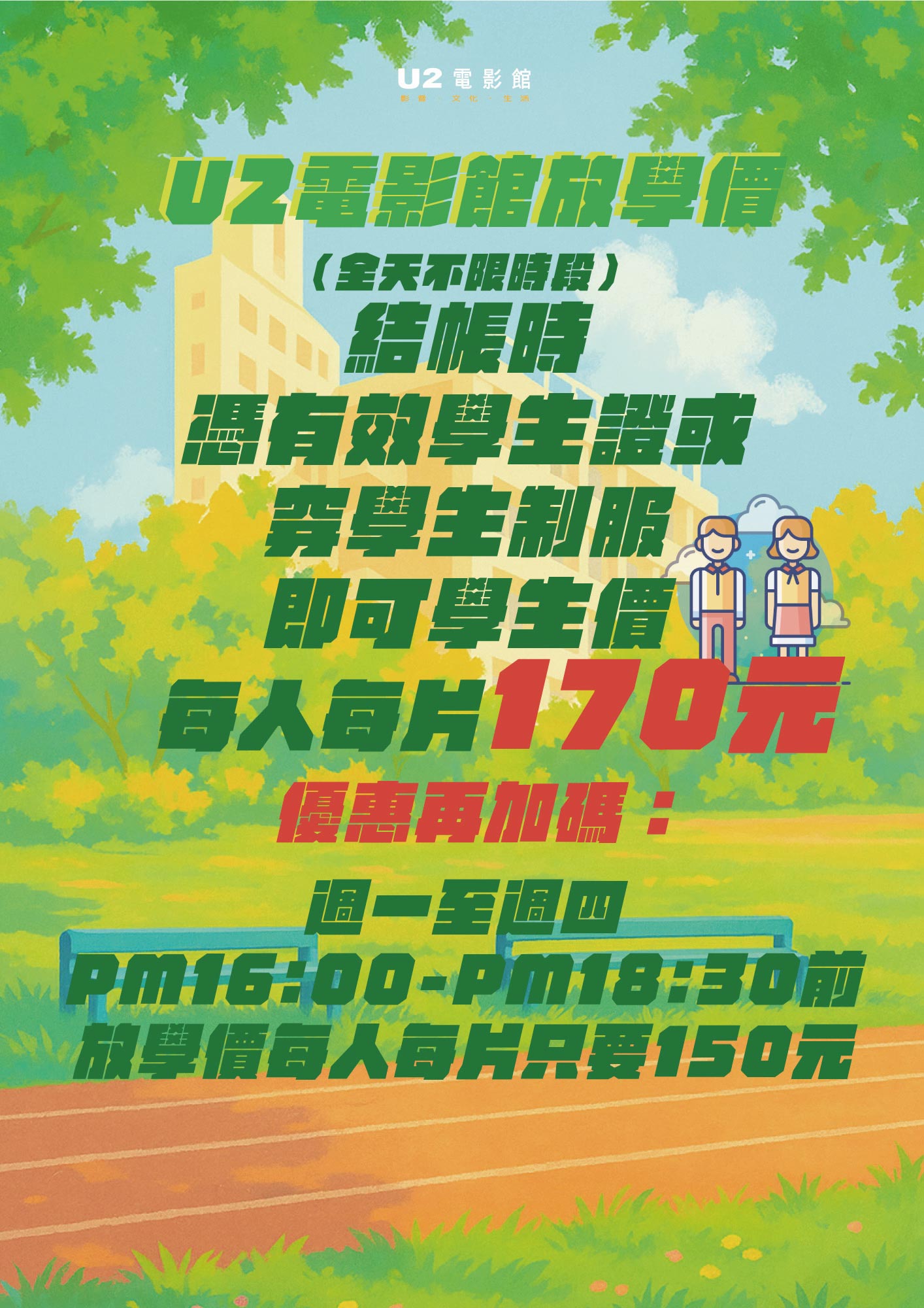 優惠二:週一至週四 PM16:00-PM18:30前,(台中館限定時間:週一至週五)放學價每人每片只要150元。